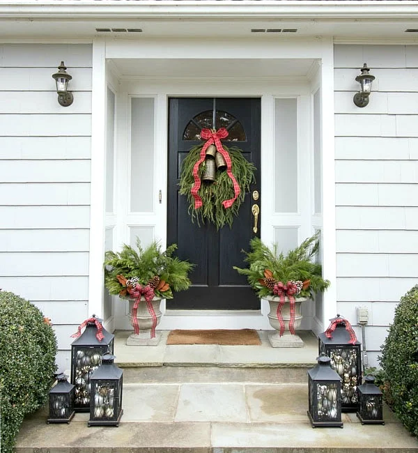 🔔Christmas house tour - a trio of lanterns filled with ornaments, planters filled with greenery, and a greenery swag on the front door are simple porch decorations for Christmas🔔