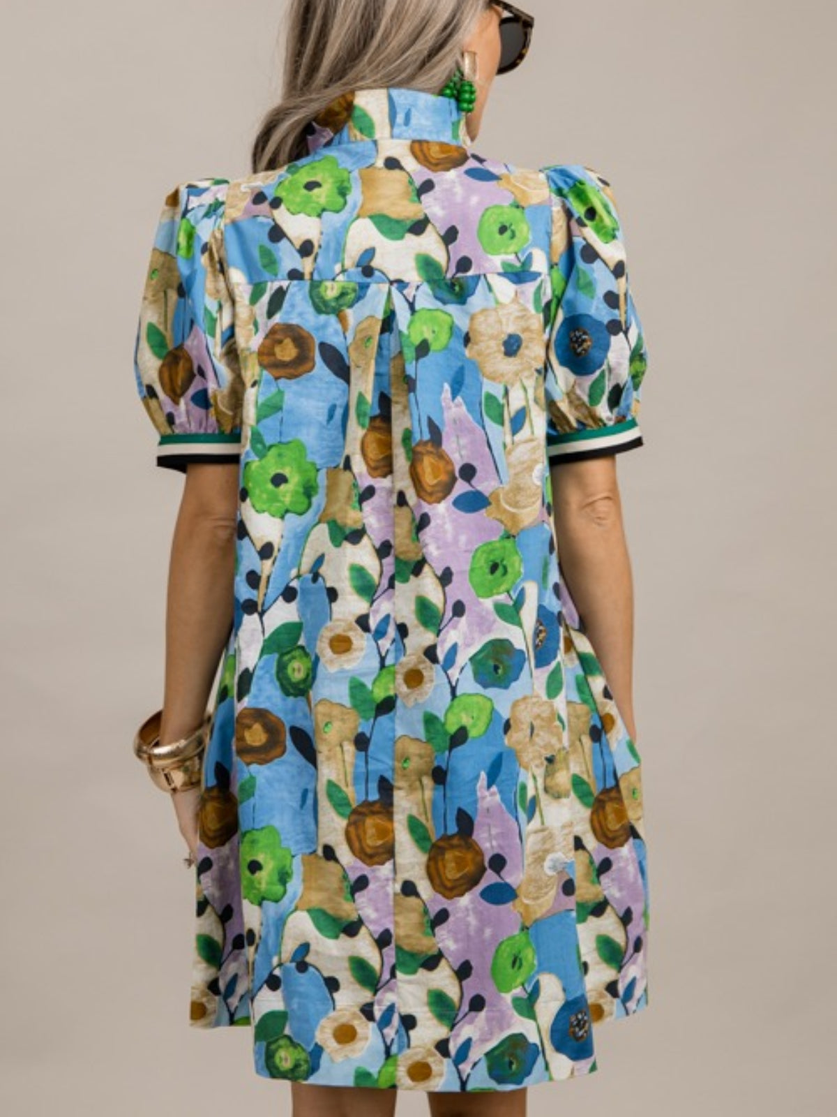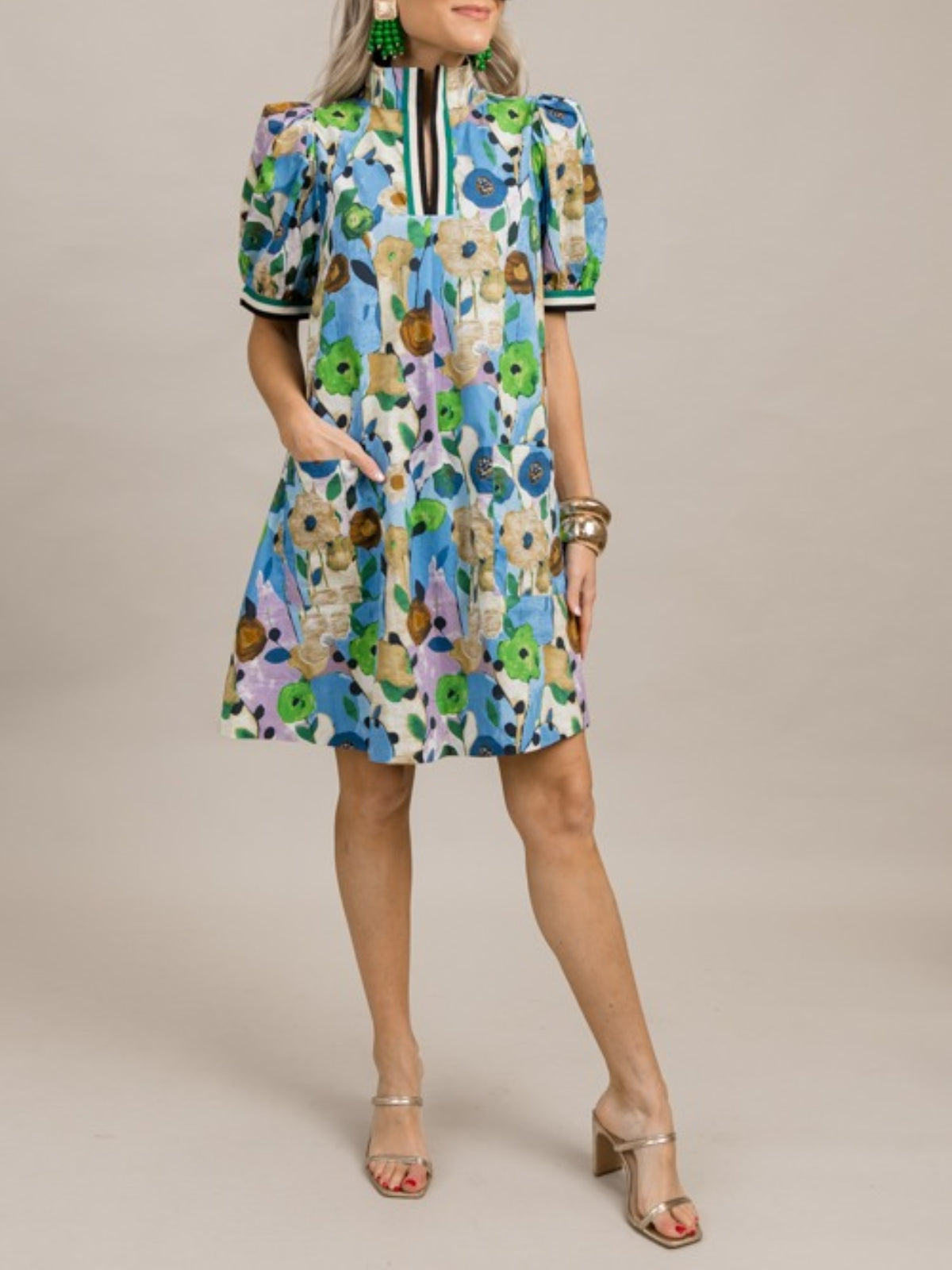 We're carrying our flirty floral style right into fall with this cute new dress. A pink, ivory, and brown stripe band trims the neckline and sleeves, creating a chic and modern look. The fit flows effortlessly on the body thanks to strategically placed pleats on the center of the front and back. Dress features a standing collar, puff sleeves, and patch pockets. Pair it with anything from sneakers to boots!