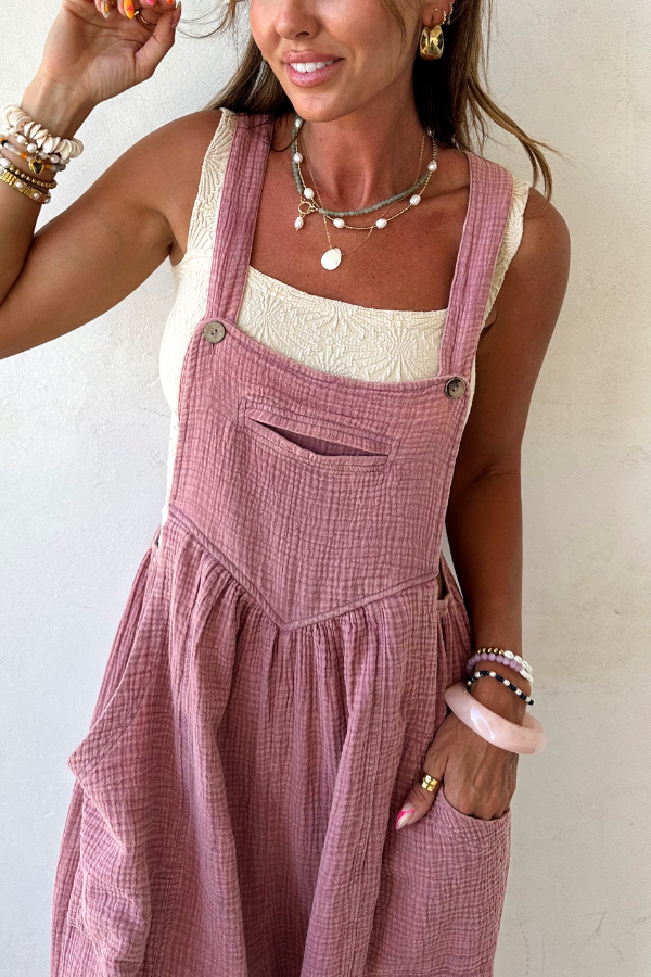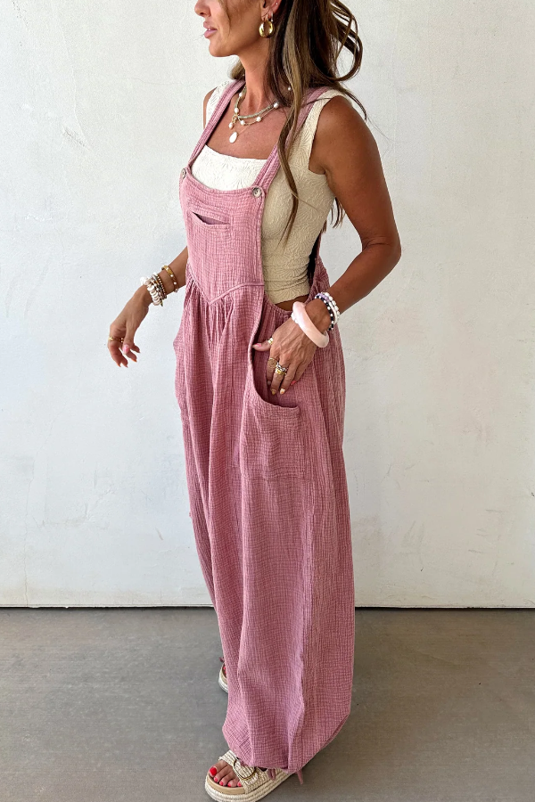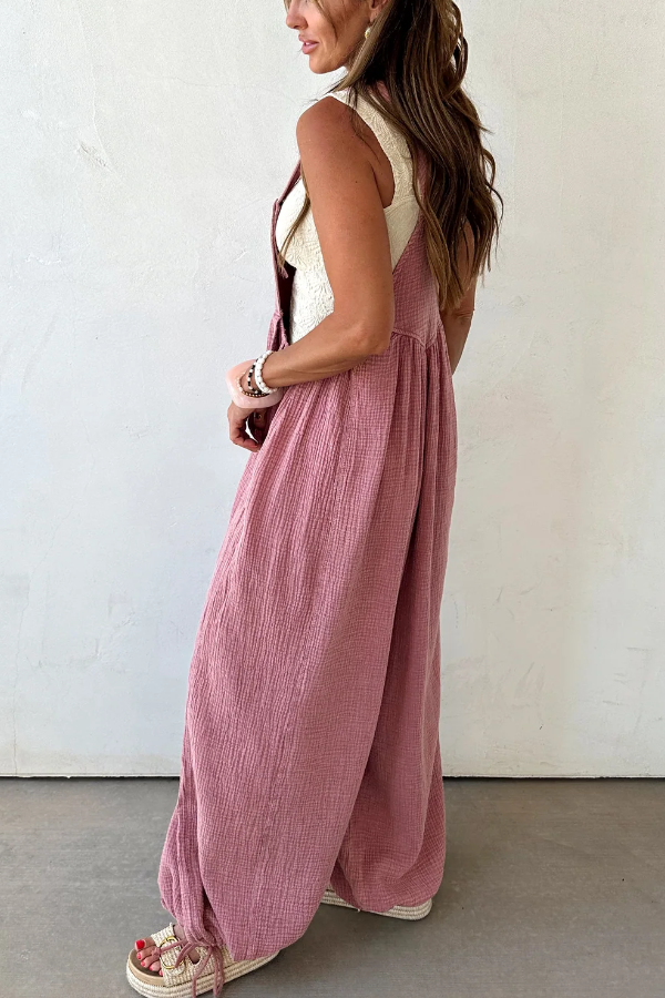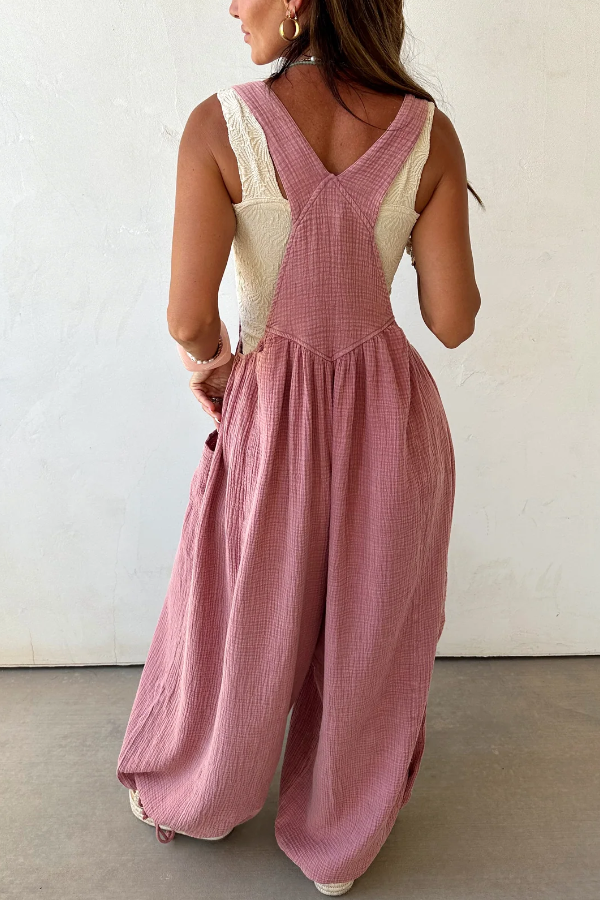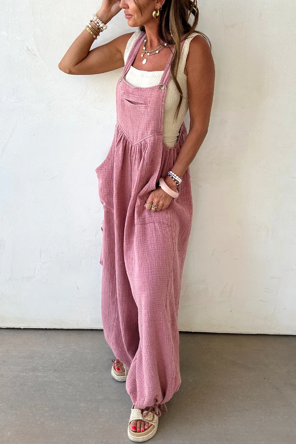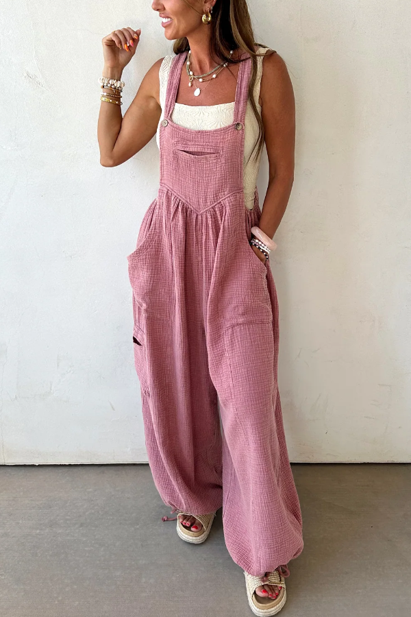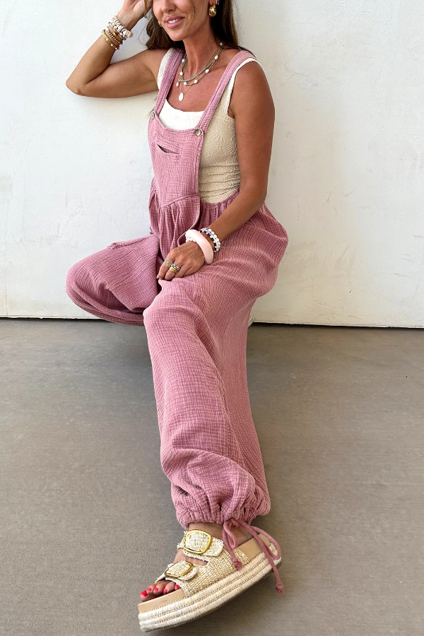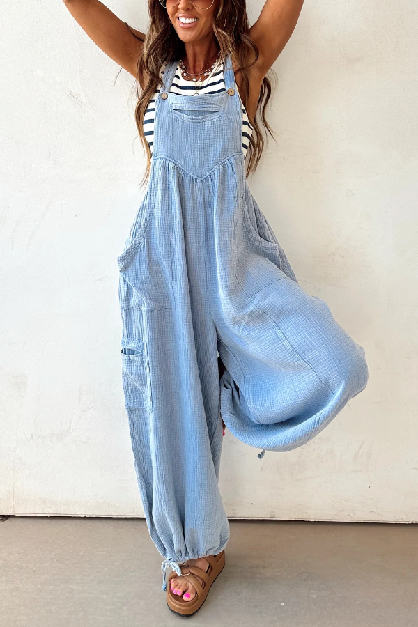 Light blue gauze-textured jumpsuit with a relaxed, wide-leg fit,Features oversized front patch pockets and a subtle v-seam detail on the chest,Adjustable shoulder straps for a customizable fit,Drawstring ties at the ankles for added shape and style,Breathable and lightweight fabric—perfect for warm weather layering
