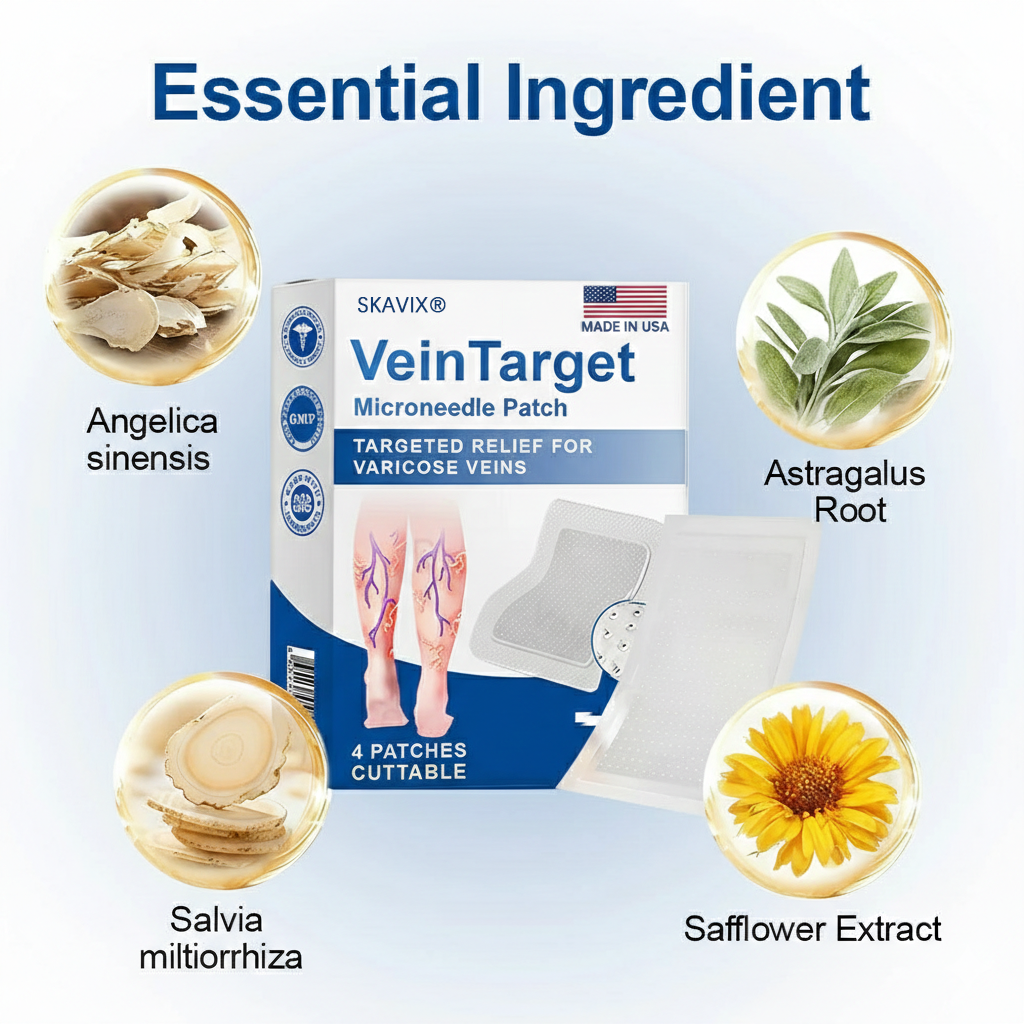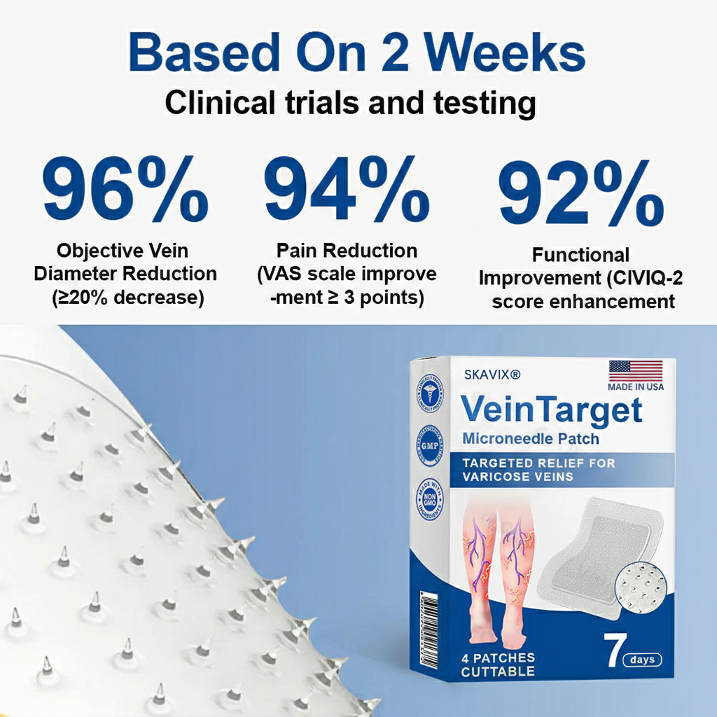 Skavix® VeinTarget is the first GMP-certified Alpine herbal microneedle patch with a clinically proven 96% success rate in treating chronic venous insufficiency at home. Its breakthrough transdermal delivery system penetrates 100x deeper than topical creams and delivers visible vein reduction in just 7–14 days. Skip the costly surgical procedures and restore healthy circulation naturally – all from the comfort of your home.