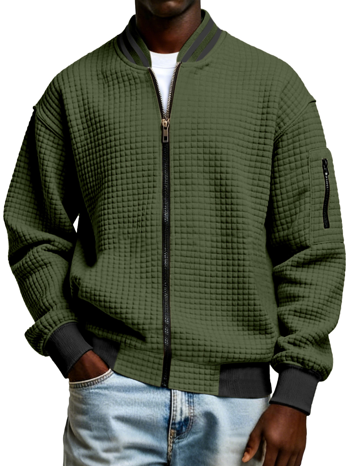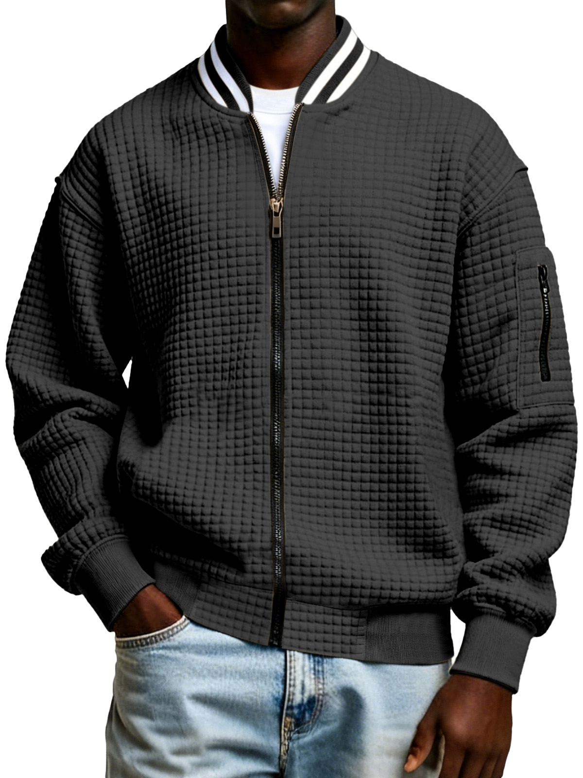 Men's Plaid Texture Solid Color Zipper Stand Collar Sweatshirt Jacket